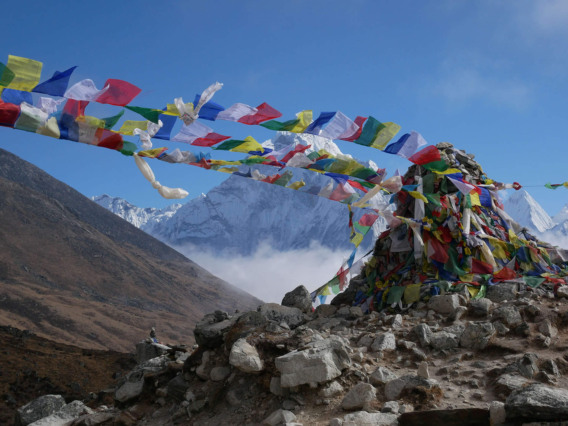 Descend through the rhododendrons forest with views of the valley to our right. Dudh Koshi river approaches as we pass a mani wall and arrive at Ghat. We follow the Dudh Khosi river to Phakding.